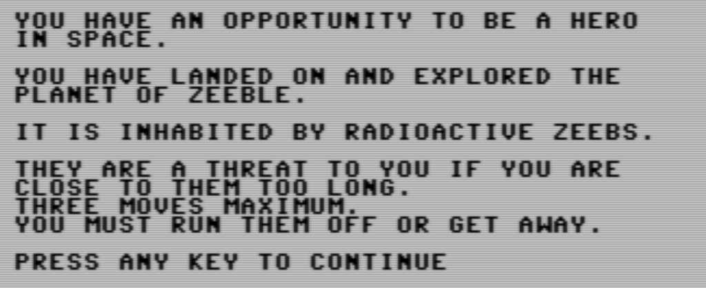 On loading up the tape image we’re presented with the above screen before being told we have a limited supply of air and a back pack that will only carry 3 items. Putting the familiar sinking feeling one gets with these PD games to one side, let’s see what the planet Zeeble has in store for us…