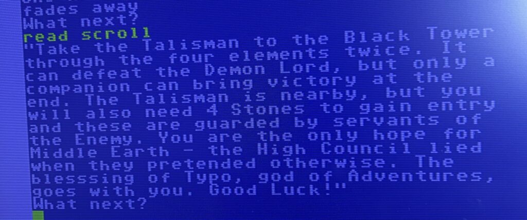Adventure Quest was not Level 9’s first game but it was the first alphabetically, and as I am sticking to that ridiculous notion, it comes next in the list. It is part 2 of a trilogy of games, initially released separately, which featured themes and names inspired by (stolen from) the books of J. R. R. Tolkien and so became known as the Middle-Earth Trilogy before being expanded and rereleased together in 1986 as a compilation. At that point the references to Middle Earth were removed and the trilogy was retitled Jewels of Darkness.